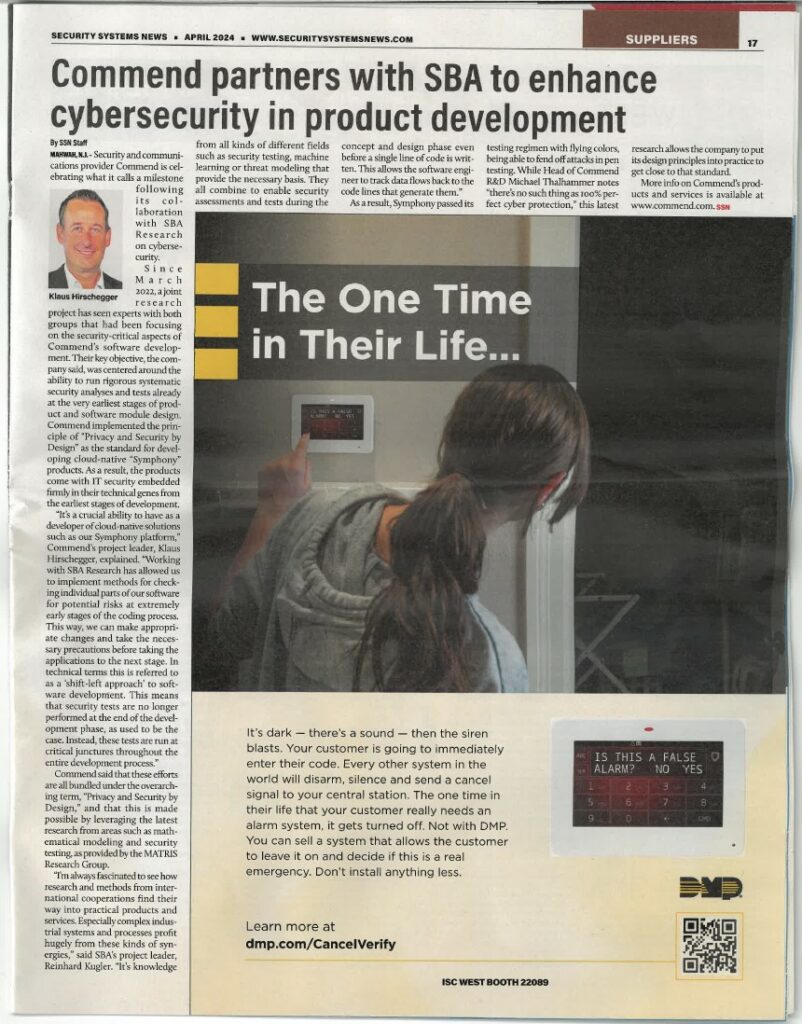 Last year, the lead of MARC, Reinhard Kugler, started a successful applied research-driven consulting project on cybersecurity with the security and communications provider Commend, concluding successfully in the last quarter of 2023. Reinhard Kugler, together with security researchers and experts from MARC and SBA, consulted experts and software developers from Commend on the security-critical aspects of Commend’s software development, such as cloud-native “Symphony” products, embedding security-critical facets in the development phase.