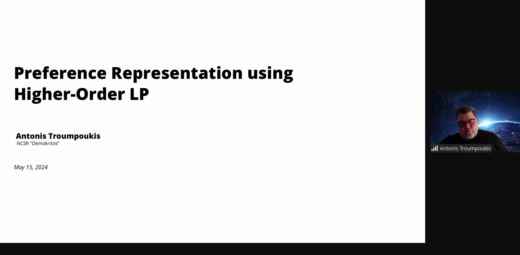 On May 15, 2024, Antonis Troumpoukis from one of the prominent research centers of Greece, NCSR-Demokritos, gave a remote talk at the MATRIS seminar. His talk titled “Preference Representation using Higher-Order LP” addressed extensions of logic programming for preference representation. In his talk, Antonis covered foundational aspects and applications of this framework. The ensuing Q&A sparked a lively discussion, touching on many topics from different branches of computer science.